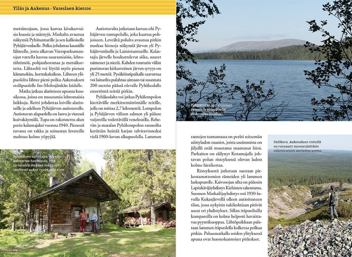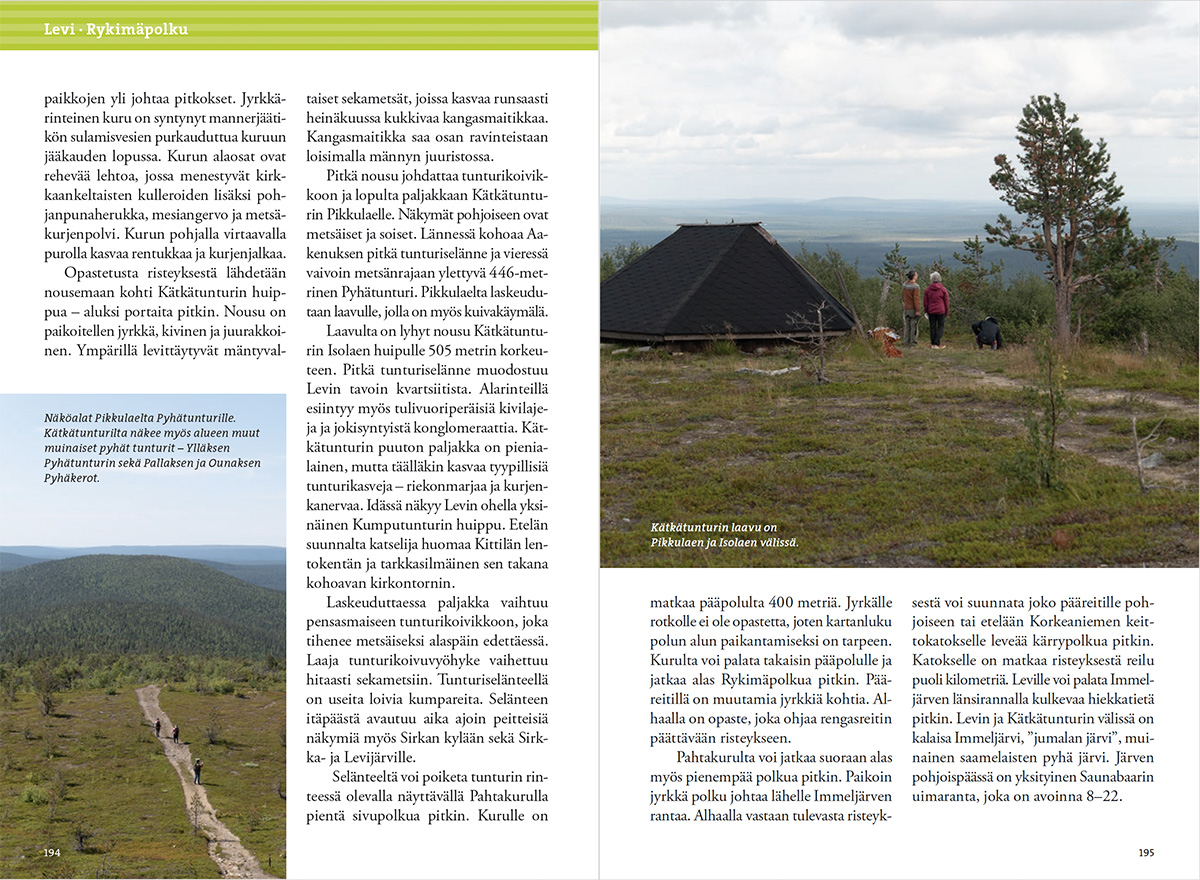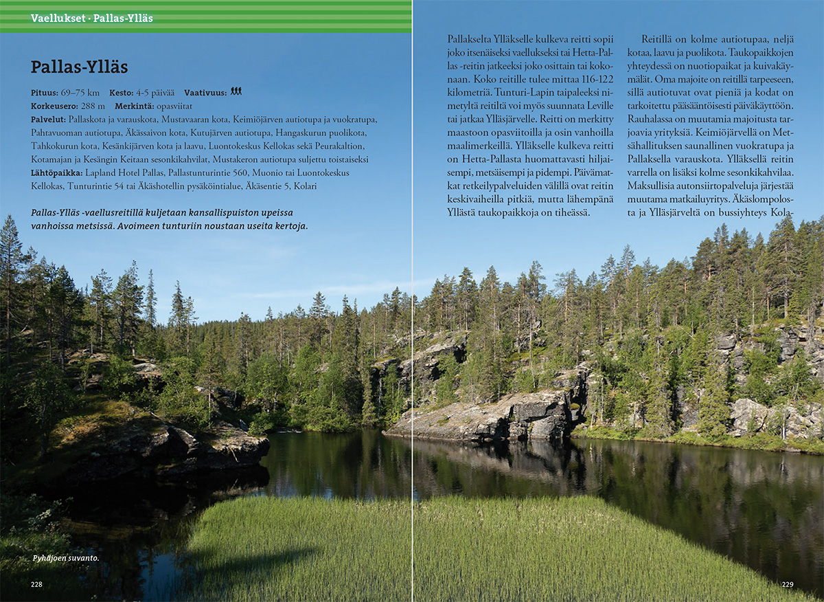 This guidebook, written in Finnish, presents 46 day hikes and 3 longer trekking routes. It covers the entire national park with surrounding summer trails, as well as marked routes around Hetta and Levi. The book is divided into four geographical sections and also includes chapters on nature and history, along with practical advice for a successful hike.
