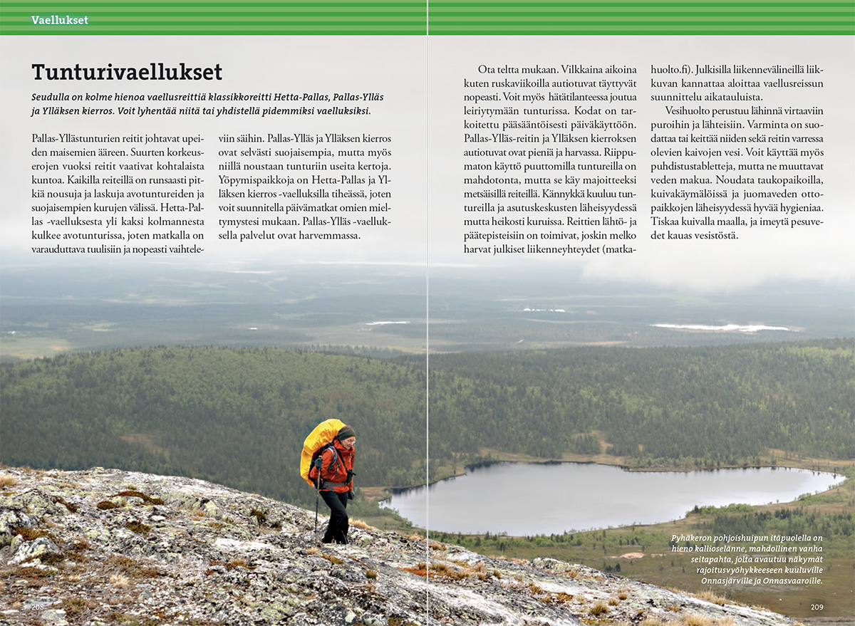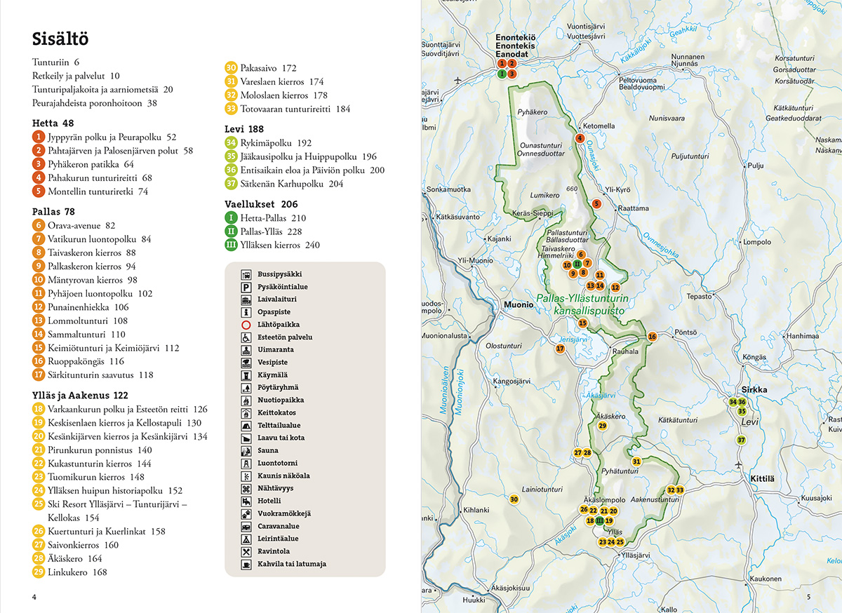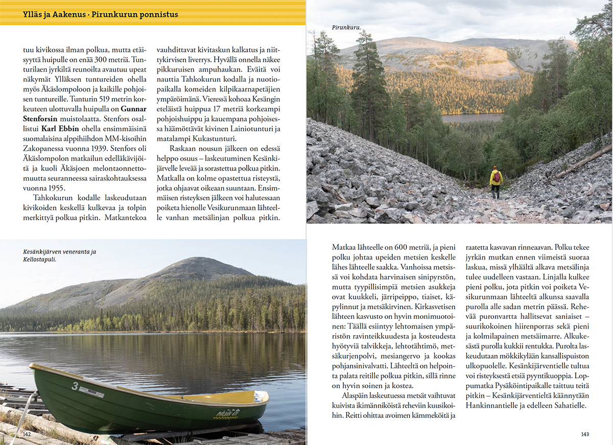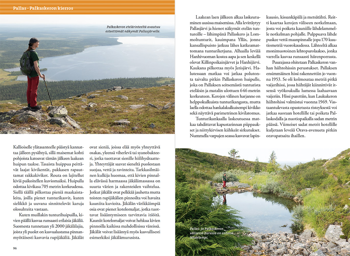 This guidebook, written in Finnish, presents 46 day hikes and 3 longer trekking routes. It covers the entire national park with surrounding summer trails, as well as marked routes around Hetta and Levi. The book is divided into four geographical sections and also includes chapters on nature and history, along with practical advice for a successful hike.