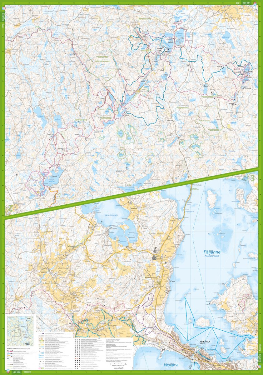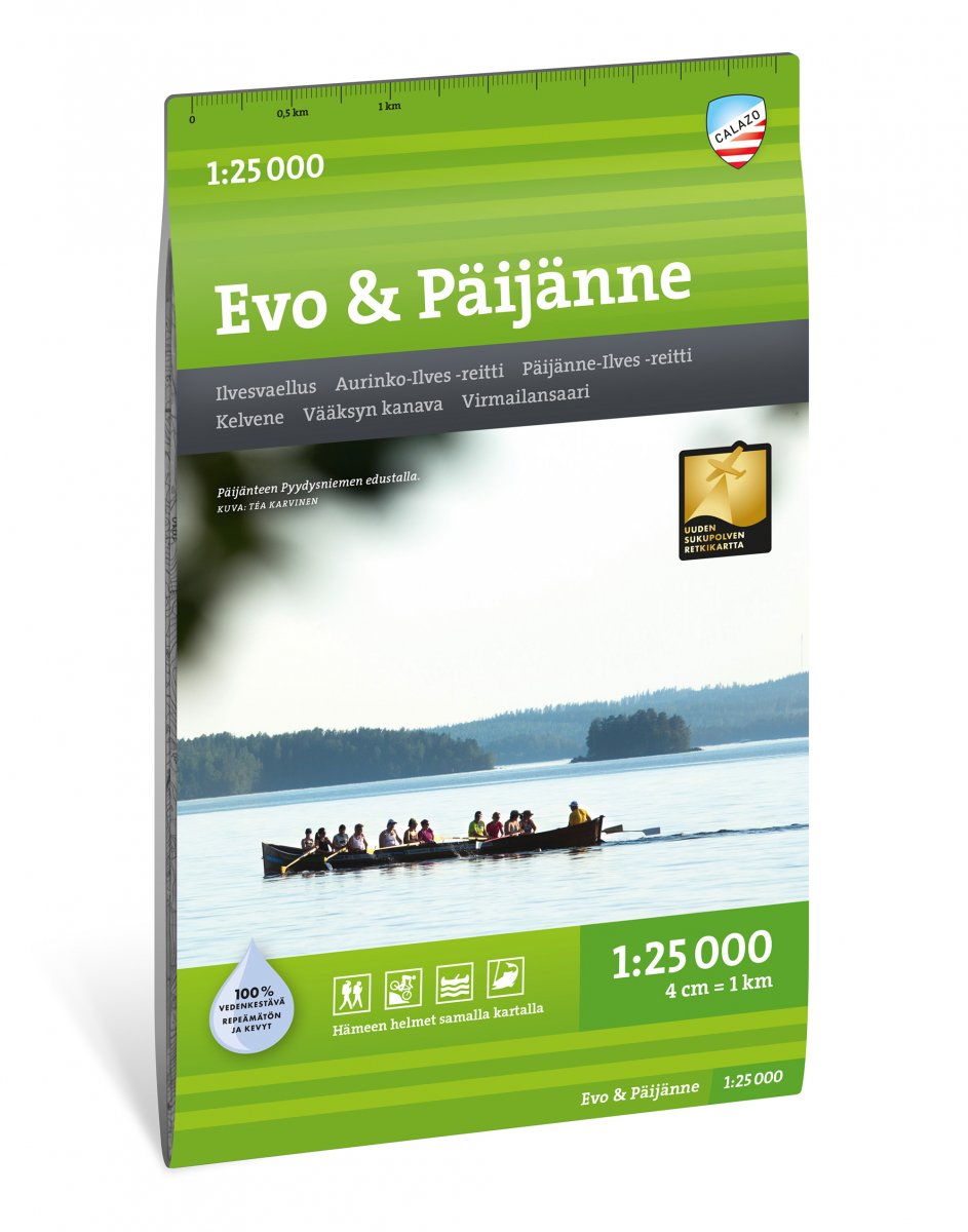 Evo Ilvesvaellus Trail runs through the Evo outdoor area all the way to Lake Päijänne. From there you can take the ferry to Kelvene Island and visit Päijänne National Park. The map also covers Virmailansaari Island and the Vääksy Canal.