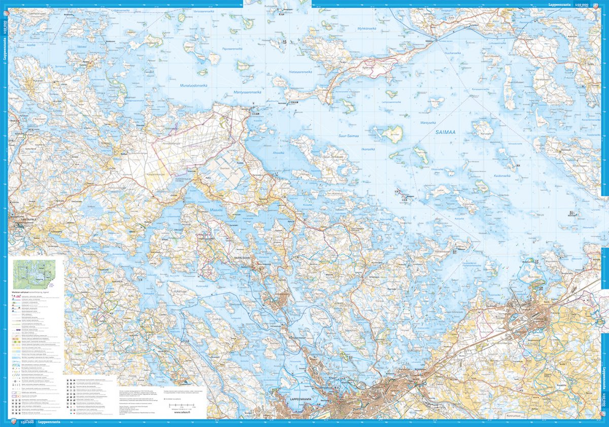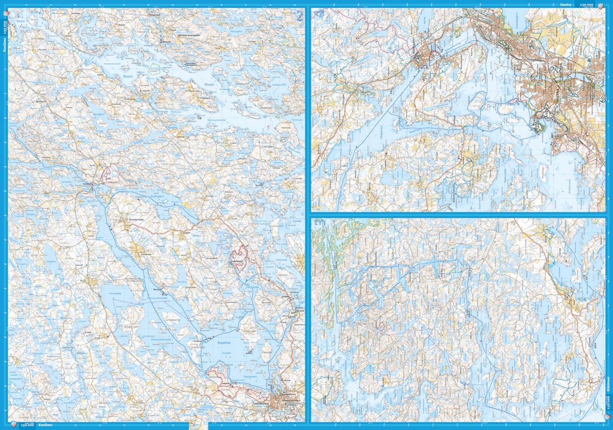 The Ice Age sculpture Salpauselkä once held back the waters of the large lake until Imatrankoski burst its channel into it. The handsome Kyläniemi of the second Salpausselkä with its sandy beaches still divides Saimaa in two. Lakes and ridges have been important routes for thousands of years. The figures painted on the rocks of Astuvansalmi tell about our ancestors' relationship with the surrounding nature, which is still represented by the endangered Kuolimo nieri. The map covers southern Saimaa from Lappeenranta to Kyläniemi and Kuolimo, Yövesi and Käkövesi. In addition to hiking information, it contains the historical and geological sites of the Geopark project. The lakes are described with depth readings, depth zones of the shores, channels and sea marks. Saimaa Geopark cherishes Saimaa's geological heritage, history and culture. The goal is to increase residents' appreciation of their home region and bring valuable heritage into everyday life. Our map is printed on the excellent Tyvek® material, which is water-resistant and tear-resistant. So you don't have to protect your map from the rain and your map doesn't tear during use. The manufacturer guarantees that the material will last 20,000 folding times. Thanks to the ingenious division of the pages, all the most important excursion destinations in the area can be found on one map. March 2019