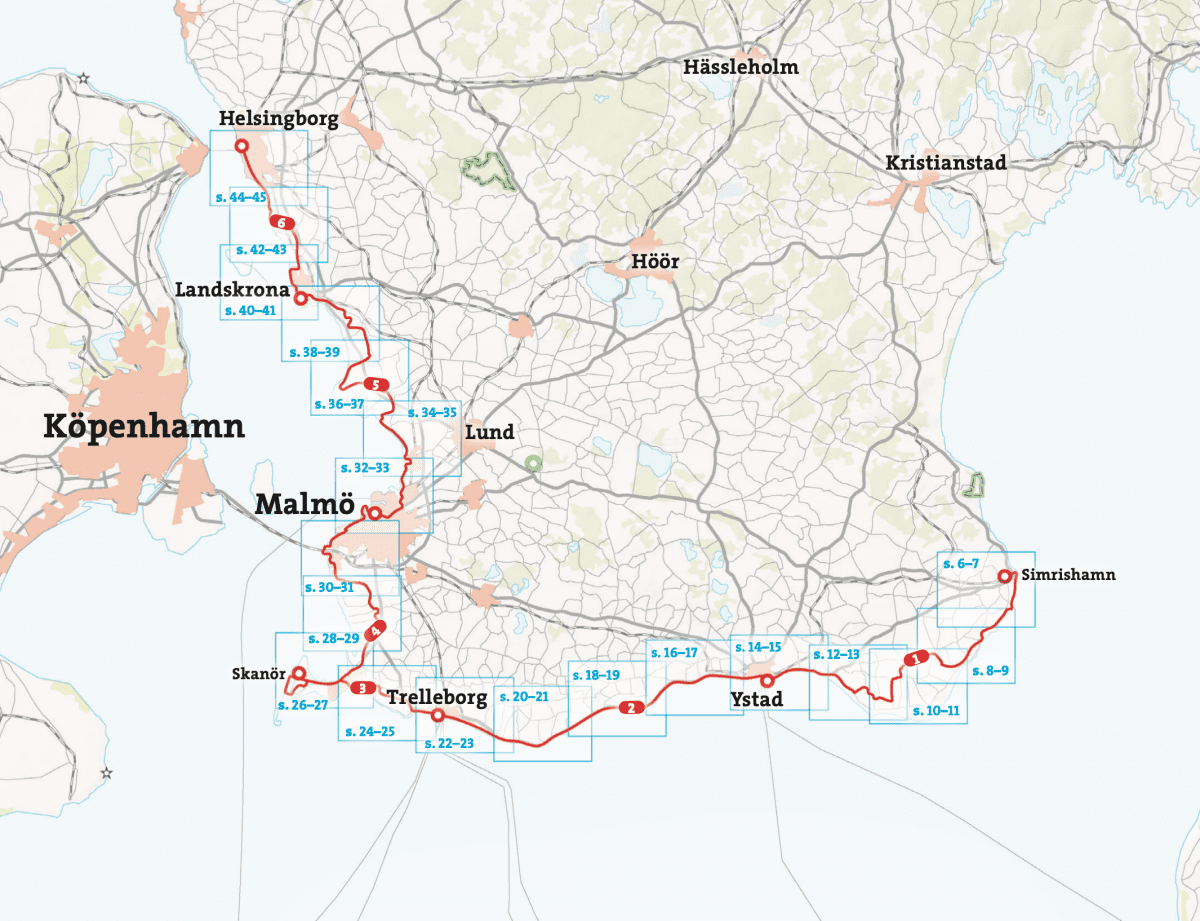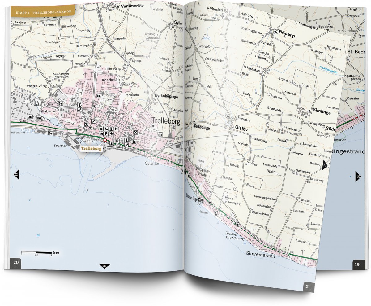 The southern coast trail follows the Scanian coast from Simrishamn to Helsingborg. The trail is 26 miles long and divided into six stages. You mostly make your way on lightly ramped cycle paths or small roads with sparse car traffic. The range of both accommodation and food is large along the way and you pass an innumerable number of fine beaches, bathing cliffs, piers and cold bathhouses. This cycle atlas covers the entire length of the trail with 20 specially developed maps in handy book format. The maps show whether the trail runs on asphalt or gravel, whether it is a cycle path or a busy road and where there are cycle services, cafes and accommodation.