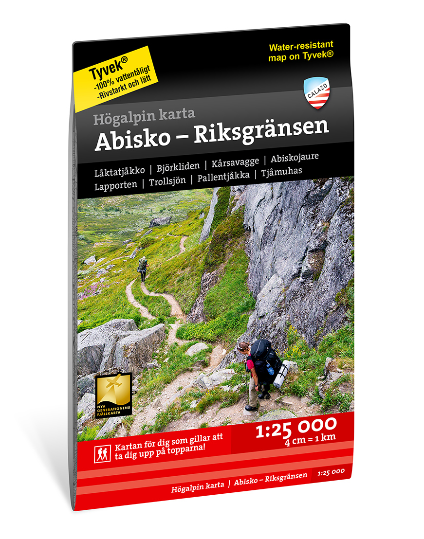 This is a unique map with a wealth of detail that has never before been found over the area around Abisko and the national border. The terrain information in the map is based on airborne laser scanning. For the first time, cliffs, larger rocks, forests and streams appear with an accuracy that truly corresponds to reality. The current extent of the glaciers has been produced in collaboration with the Department of Natural Geography at Stockholm University. A map on a scale of 1:25,000 provides good support for those who do summit tours, glacier hikes or otherwise leave the marked paths of the valleys and try new routes at a higher altitude. We have come to the conclusion that the best material for a map is Tyvek®. It is made of a synthetic fiber that makes the map completely insensitive to water and very tear-resistant. A Tyvek map will not tear in the folds or lose color when you use it.