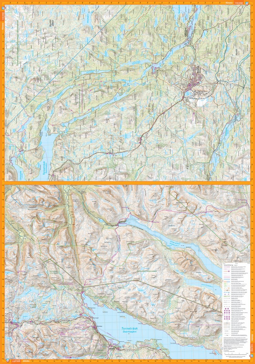 This map covers the mountain area north of Kiruna and Abisko up to Treriksröset. The map contains large areas on both sides of the national border between Sweden and Norway and is perfect for those who want to hike the Nordkalottleden between Abisko and Kilpisjärvi or visit Vadvetjåkka national park. If you hike the Gröna band and have followed the entire mountain range north from Sälen, this will be the very last map you take out of the pack.