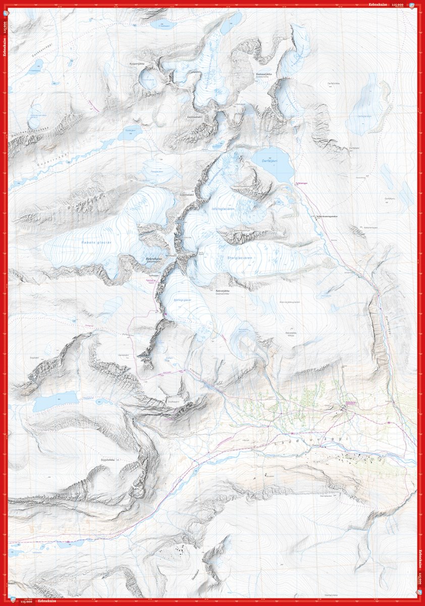 This is a unique map with a wealth of detail that has never before existed of Sweden's highest mountain. The terrain information in the map is based on airborne laser scanning. For the first time, cliffs, larger rocks, forests and streams appear with an accuracy that truly corresponds to reality. The glaciers' current extent and fracture zones have been produced in collaboration with the Department of Natural Geography at Stockholm University. A map on a scale of 1:15,000 provides good support for those who do summit tours, glacier hikes or otherwise leave the marked trails of the valleys and try new routes at higher altitudes.